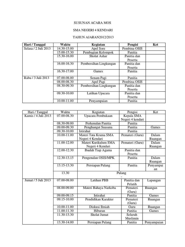 Untuk mempermudah bapakibu kepala sekolah dalam membuat Susunan Upacara Pembukaan dan Penutupan MPLS saya akan bagikan Contoh Susunan Upacara Pembukaan dan Penutupan MPLS terbaru 2018. SUSUNAN ACARA MPLS TAHUN AJARAN 2019 2020 Selasa 16 Juli 2019 No Waktu Materi PemateriFasilitator 1 0630 - 0700 Persiapan Panitia 2 0700 - 0800 Upacara Pembukaan Kepala Sekolah 3 0800 0830 Perkenalan Guru dan Staf TU SMA Negeri 2. Kegiatan MPLS atau Masa Pengenalan Lingkungan Sekolah adalah kewajiban bagi siswa yang baru masuk di semester pertama sekolah menengah.