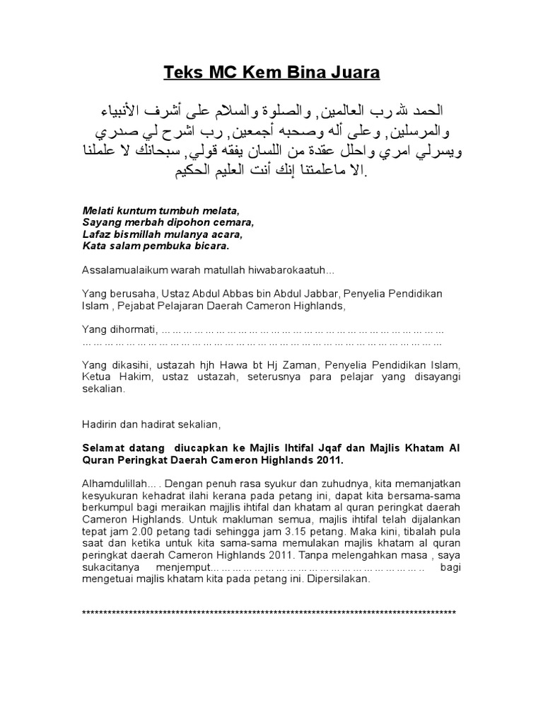 Teks Pembawa Acara Teks MC Pengajian yang dilakukan di acara pengajian. Contoh Teks MC Bahasa Arab di Berbagai Acara. Contoh kata sambutan acara khatam quran.