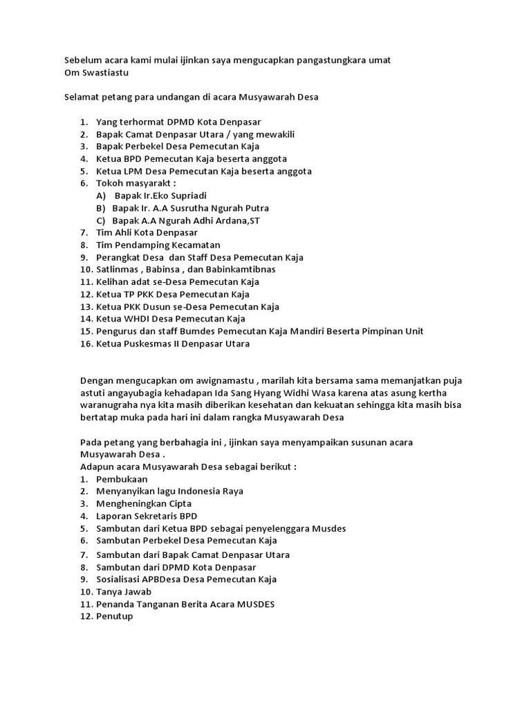 Musdes rkpdes susunan acara dan pembahasan 2020. Contoh susunan acara rapat musyawarah desa cuitan dokter. Teks pembawa acara musyawarah desa terbaik.