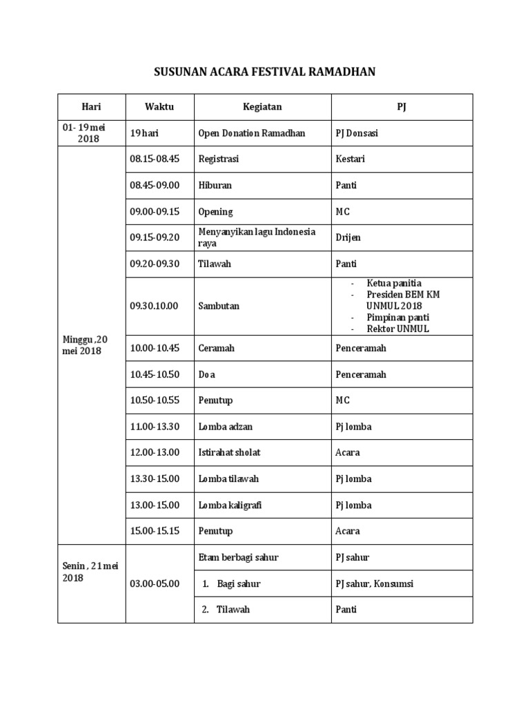 23 rows Jika kamu butuh contoh Rundown Event dibawah ini sudah Dunia Public Relations persiapkan satu contoh Susunan Acara pada sebuah event Parade Band. Di bawah ini ada beberapa contoh yang dapat dijadikan sebagai sebuah acuan didalam menyusun ataupun membuat contoh dari rundown acara atau disebut pula dengan nama susunan acara. Sacrifice for Association adalah serangkaian kegiatan yang diselenggarakan oleh anggota komunitas Surabaya Bersatu di bawah naungan PT.