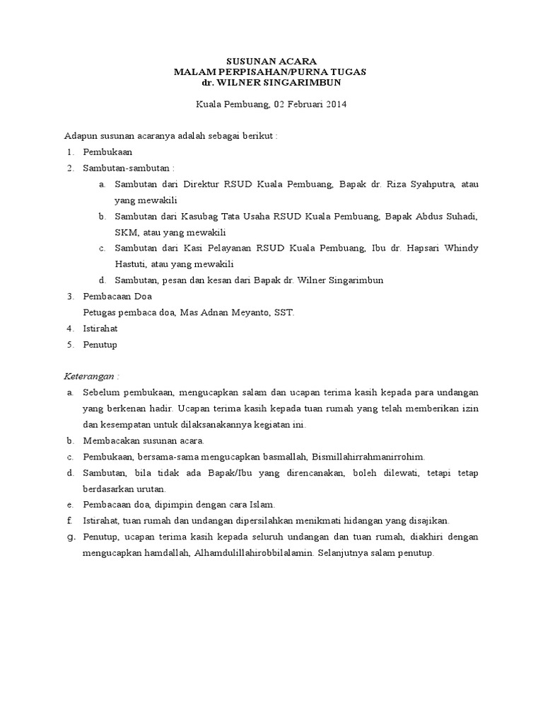 Contoh susunan acara pelepasan purna tugas. Yang saya hormati bapakibu hadirin acara pelepasan purna tugas pada siang hari ini. Kegiatan tersebut dihadiri oleh Kepala Badan Kepala Bidang dan pejabat struktural lainnya serta pelaksanatenaga honorer di lingkungan BKPSDMAD Kabupaten Sambas. Dan sebagai Koordinator Kerohaniaan Islam KORPRI di kantor saya ditunjuk sebagai pembaca doa dalam acara pelepasan tersebut.