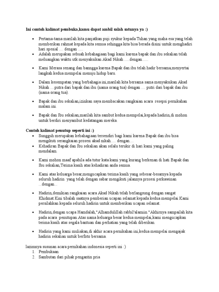 Sedangkan acara yang paling sakral dan ditunggu-tunggu di dalam pernikahan adalah acara akad nikah. Alhamdulillah wa sukurillah kalayan aya dina ridho ti alloh swt oge pangdua tipara wargi sadayana acara akad nikah parantos rengse kalayan aya dina kalancaranmudah-mudahan aranjeuna nu janteun panganten sing tiasa ngawangun rumah tangga anu sakinah mawadah warohmahkacai jadi saleuwi. Teks susunan acara akad nikah ada banyak hal yang harus dipersiapkan saat menjelang hari pernikahan.