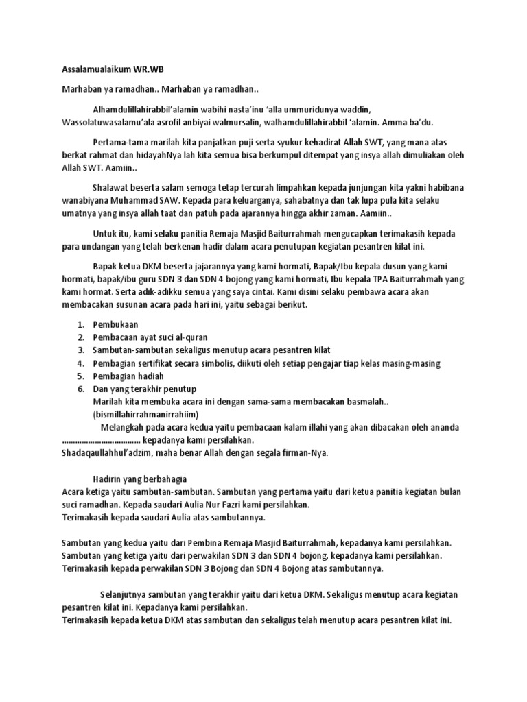 Serta rekan-rekan Panitia Agustusan dan adik-adik yang kami cintai. Biasanya acara pengajian diadakan untuk mengisi acara seperti pemberangkatan haji bulan rajab Muslimat Fattayat pengajian rutin setiap minggu dan sebagainya. Teks Mc - Upacra apel penutupan funcamp 2017 akan segala dimulai Pemimpin upacara memasuki lapangan upacara - Penghormatan umum kepada.