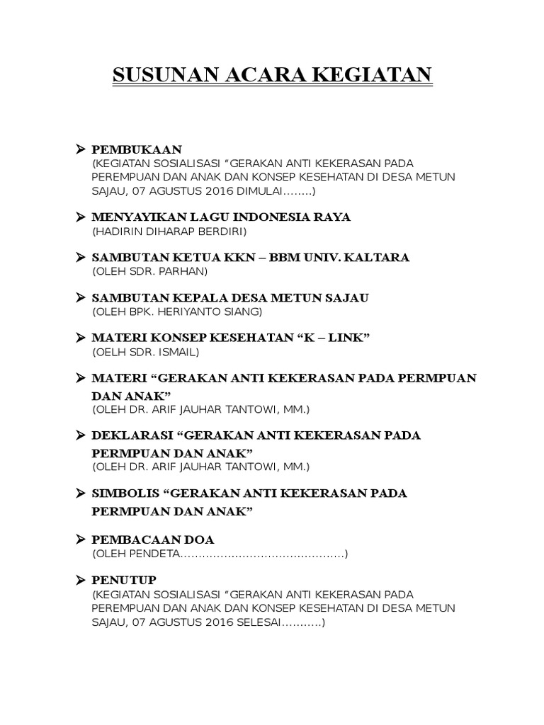 Berbagai contoh susunan acara dibuat sesuai dengan urutan dari jalannya suatu acara. Contoh Teks MC Konser Musik. Dengan kepala desa dalam hal menentukan dan menyepakati jadwal penyuluhan di lokasi tersebut sesuai dengan kondisi peserta.