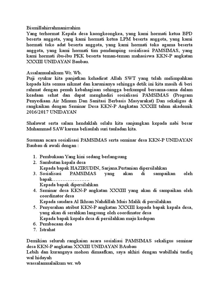 Susunan acara Musrembang Desa 1. Sebelum kita mulai acara kali ini perkenan kami untuk membacakan susunan acara. Contoh Teks Pembawa Acara Sosialisasi - Hallo sahabat Kumpulan Contoh Teks MCSelamat datang diblog kamiBlog kumpulan contoh contoh teks pembawa acara atau MC.