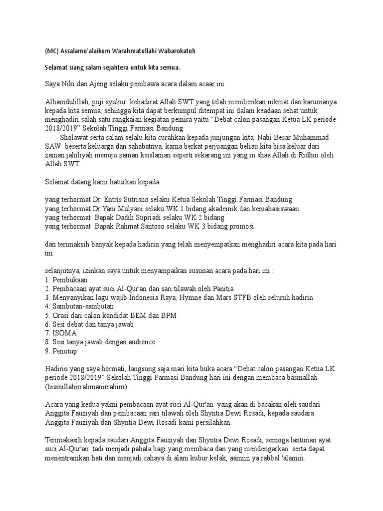 Contoh Teks MC Bahasa Arab di Berbagai Acara. Doc Teks Moderator Debat Bahasa Indonesia Kelas X Faisal Saitama Academia Edu. Contoh Teks MC dalam Bahasa Inggris Lengkap Beserta Artinya Mahmuuda Ninningrum Ladies and gentlemen Now we come into the main point that is seminar for the new students of English language department and the theme is The New Life at Campus which will be delivered by Mr.