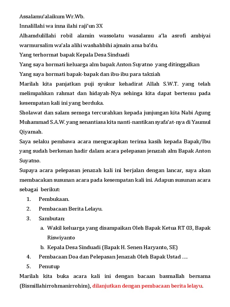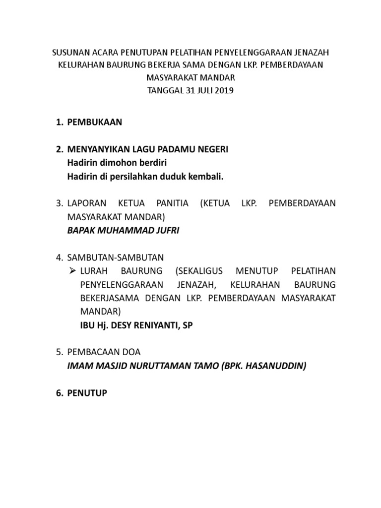 August 23rd 2020 - Supaya acara pelepasan jenazah kali ini berjalan dengan lancar saya akan membacakan susunan acara pada kesempatan kali ini Adapun susunan acara sebagai berikut buka acara kali ini dengan bacaan basmallah bersama Bismillahirrohmanirrohim Dilanjutkan acara yang ke 2 sambutan Sambutan pertama dari Bapak Kayim Kepada Bapak Dino kami. Bapak bapak ibu ibu handai taulan yang kami hormati. Namun pelaksanaan pelepasan jenazah sangatlah banyak manfaatnya khusunya bagi mayit itu sendiri baca poin kedua dan bagi shohibul musibah tersebut.