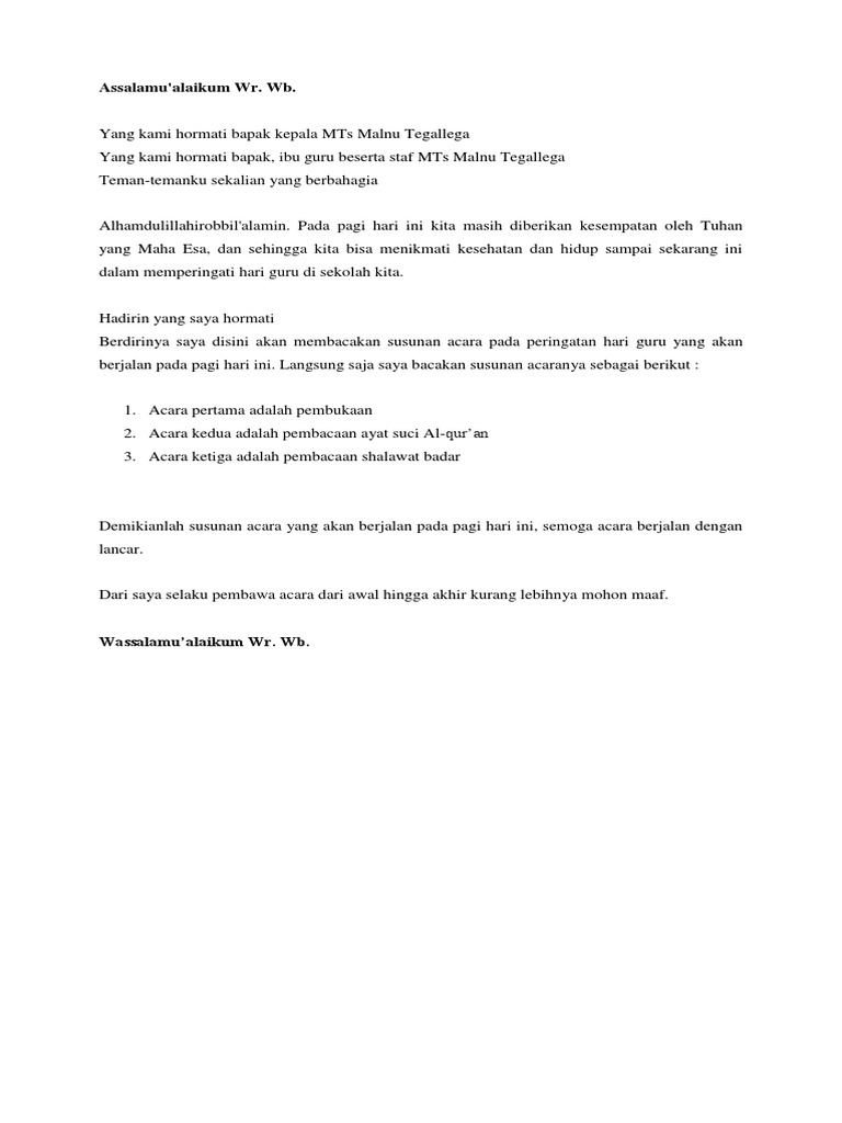 CONTOH TEKS DOA PLS PENGENALAN LINGKUNGAN SEKOLAH Assalamualaikumwrwb. Yang terhormat bapak kepala sekolah SMA Yang terhormat Bapak dan Ibu guru SMA. Contoh Teks Pembawa Acara 1 Muharram Muharram Q.