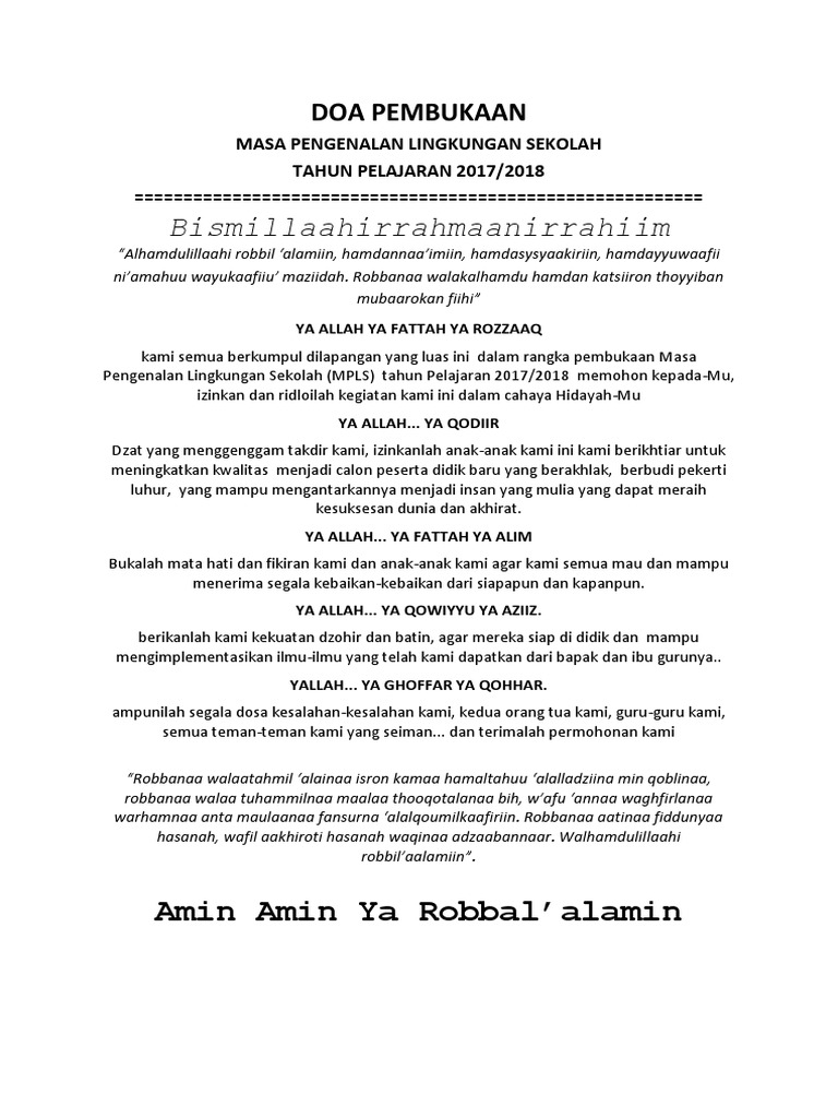 Meski singkat semoga bermanfaat. Demikian Contoh Susunan Upacara Pembukaan dan Penutupan Masa Pengenalan Lingkungan Sekolah MPLS Tahun 2020 yang dapat saya bagikan semoga bermanfaat. CONTOH TEKS DOA PLS PENGENALAN LINGKUNGAN SEKOLAH Assalamualaikumwrwb.