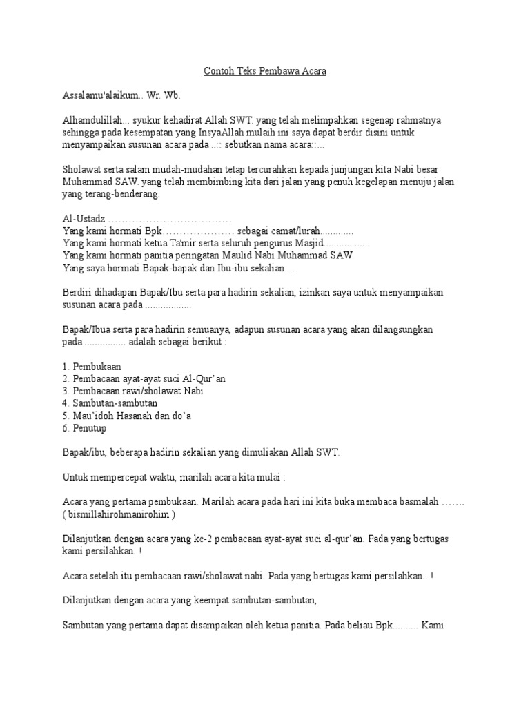 Nadia Anggi Marantika MSi. Contoh teks pembawa acara mc maulid nabi muhammad saw kal i ini saya bagikan contoh teks pembawa acara pada saat peringatan maulid nabi muhammad sebenarnya teks pembawa acara ini tergantung a cara apa saja yang akan dilaksanakan pada saat peringatan tersebut namun ini saya bagikan hanya sebagai contoh. Para Ketua RW Ketua RT serta tokoh masyarakat yang kami banggakan.