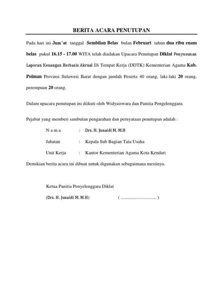 Pembuatan berita acara sebenarnya tidak jauh berbeda dengan pembuatan surat resmi hanya saja harus benar-benar diperhatikan maksud dan tujuan serta siapa saja pihak yang terlibat di dalamnya. Baiknya anda harus menggunakan bahasa baku dengan penulisan yang sesuai dengan EYD. 15 Contoh Teks Berita Singkat Tentang Pendidikan Banjir Dll 5w 1h Contoh Kata Pembuka Dan Penutup Pada Acara Kenduri Takziyah Istiqna Update 2019 7 Contoh Berita Acara Lengkap Untuk Berbagai Acara Contoh Kata Pembuka Dan Penutup Pada Acara Kenduri Walimatul Haml 17 Contoh Surat Pribadi Untuk Kakak Teman Sahabat Orang Tua Guru.