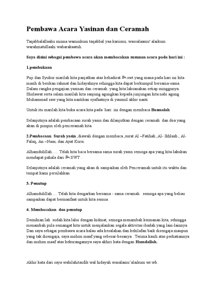 Teks Pembawa Acara Yasinan Rutin Bahasa Jawa Kumpulan Referensi Teks Pidato. Hal tersebut bertujuan agar acara nantinya bisa berjalan lancar atas izin Allah SWT. Teks-teks Sumber Tentang Yasinan Sejumlah teks tentang yasinan tidak terdapat dalam Alquran melainkan hanya dari hadis diantaranya sebagai berikut.